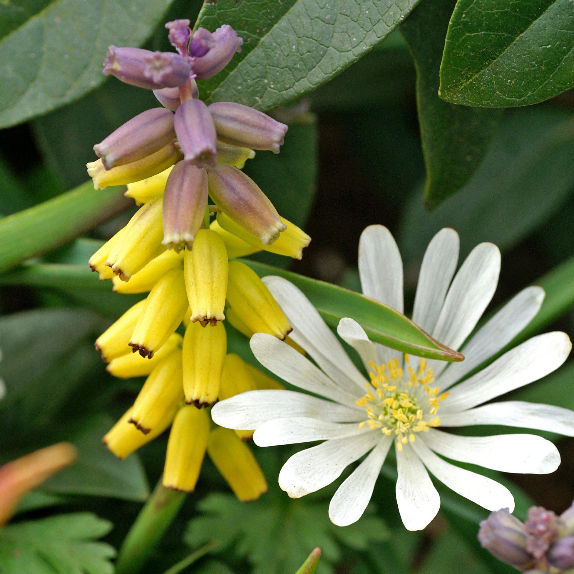 They bloom at the same time as daffodils and some early varieties of tulips and they blend perfectly in.